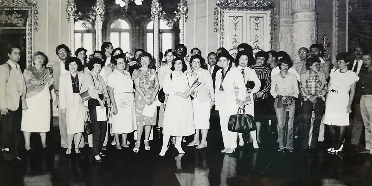 Participantes de la IV Reunión del Secretariado Permanente del ICOM para América Latina y el Caribe, Teatro Nacional, San José de Costa Rica, 1985. De izquierda a derecha: Francisco Blavia (Venezuela); Marta Arjona (Cuba); Aide Venegas (Puerto Rico); Zulay Soto (Costa Rica); Yani Herreman (México); Milagro Gómez de Blavia (Venezuela), entre otros. Cortesía de Zulay Soto.
