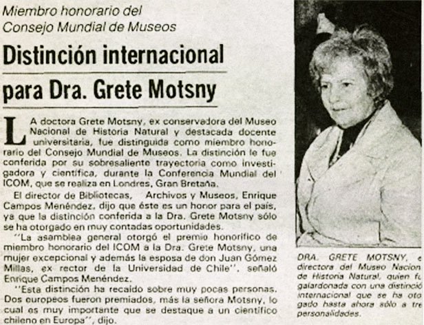 Grete Mostny es nombrada miembro honorario del ICOM. La Tercera, 4 de agosto de 1983, p. A12.