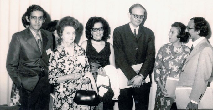 Tercer Congreso Nacional de Museos, Medellín, 1972. De izquierda a derecha: Fernando Garavito, Alicia Dussán Maldonado, Hughes de Varine, Inés Carvajal (primera presidenta de ACOM), Teresita Santamaría y Mario Hernández.