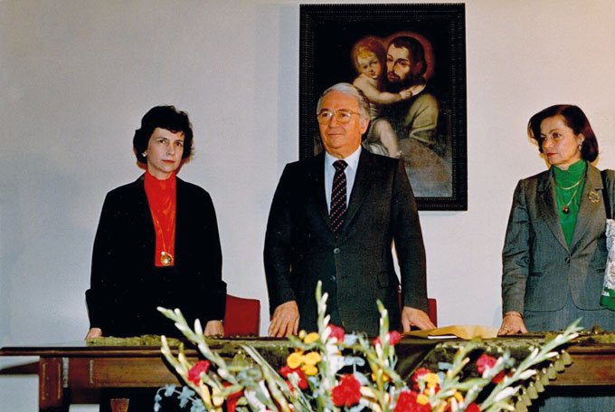 Apertura del Congreso Nacional de Museos (anteriormente: Congreso Nacional de Museos, Institutos y Casas de Cultura), Museo de la Independencia, Bogotá, 1984. De izquierda a derecha: Cecilia Duque, presidenta de ACOM, Belisario Betancur, presidente de la República, y Doris Eder de Zambrano, ministra de Educación.
